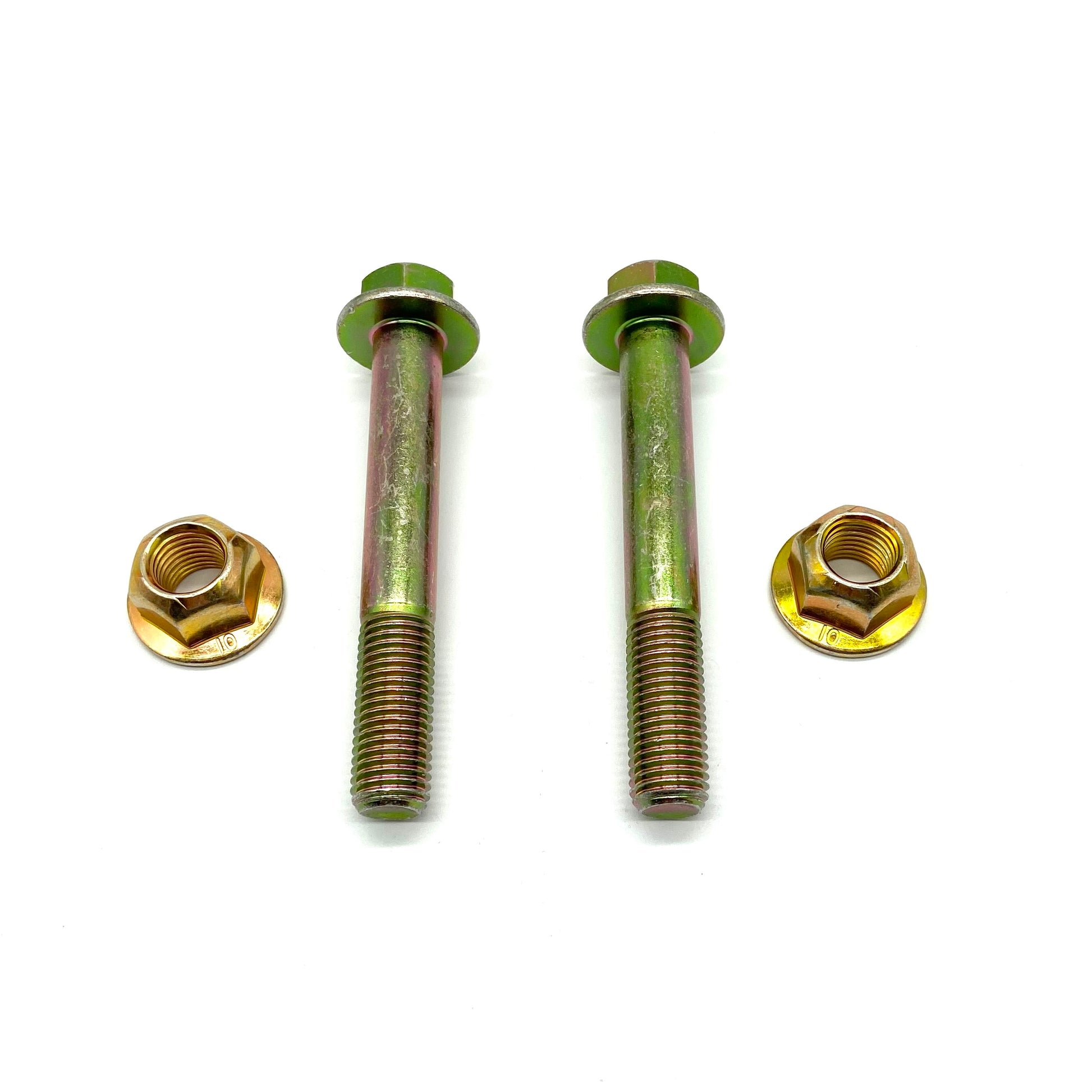 Set of (2) 10.9 Class (metric equivalent to grade 8) hardened, yellow zinc plated flange bolts and prevailing torque lock nuts for the front lower shock / strut clevis to the front lower control arm on 2011-2015 Jeep Grand Cherokee WK2. One bolt and nut is used on the drivers side, one bolt and nut is used on the passenger side.