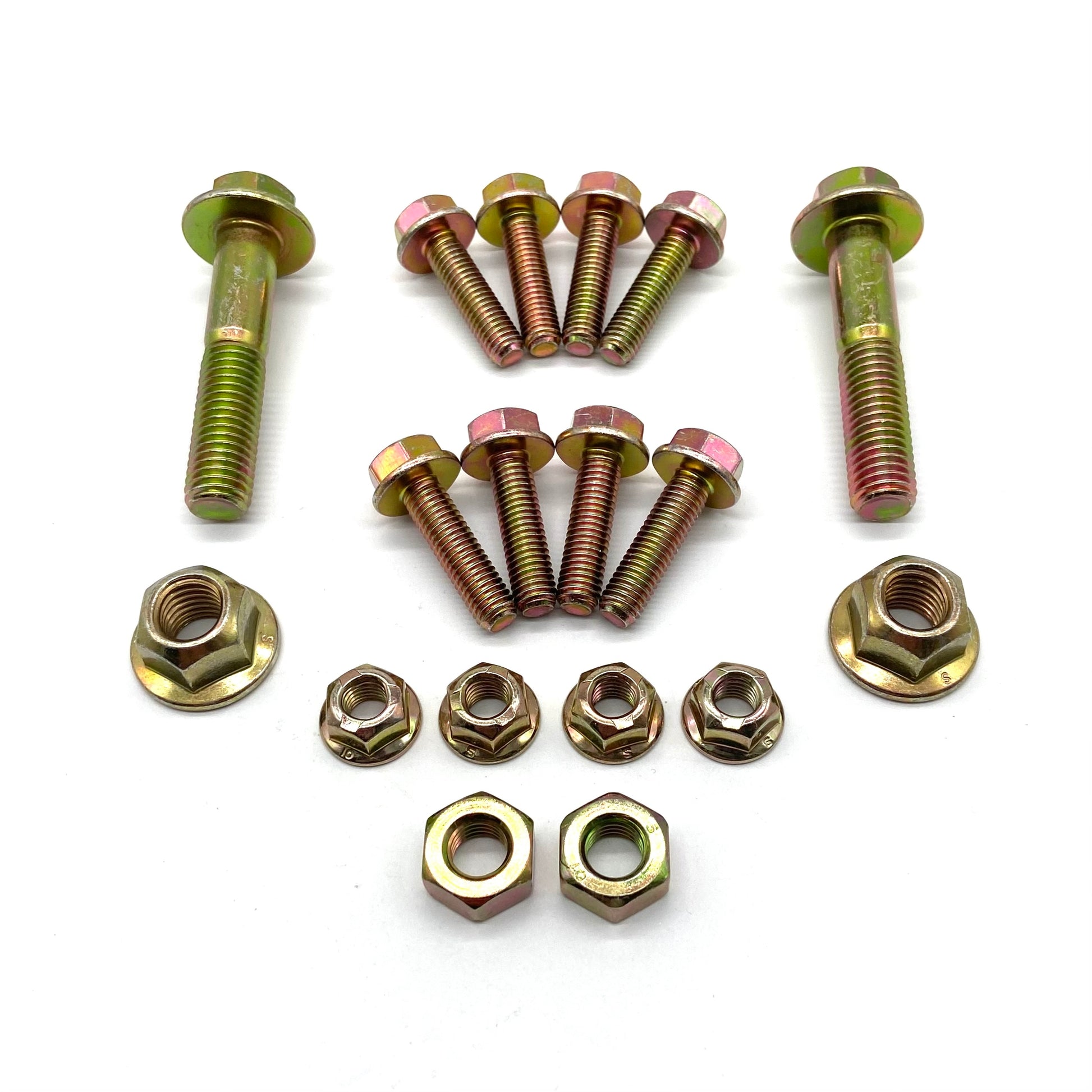 Complete set for all 4 shocks, upper and lower, front and rear. Yellow zinc Class 10.9 (metric equivalent of Grade 8) hardened bolts and lock nuts.